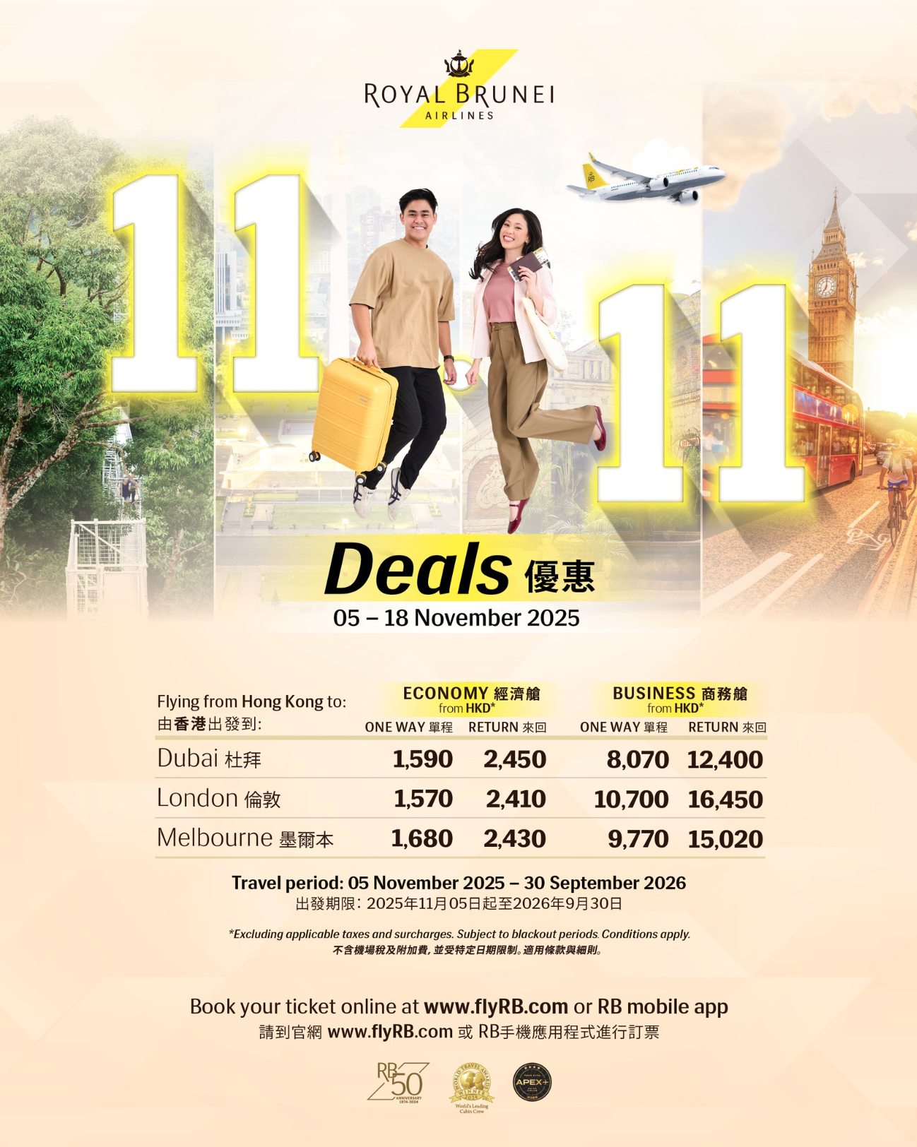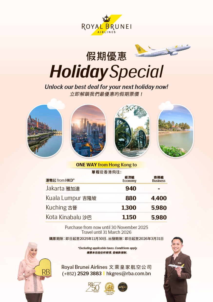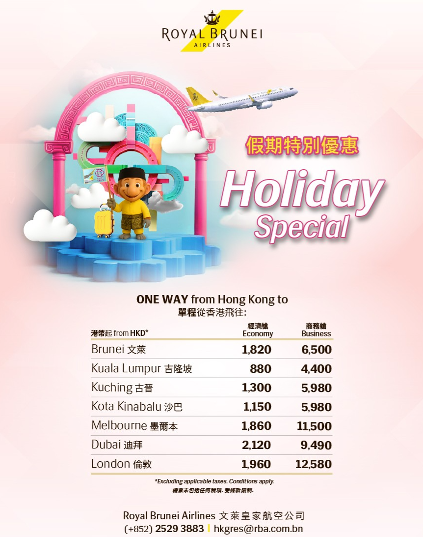 ONE WAY from Hong Kong to Brunei, Kuala Lumpur, Kuching, Kota Kinabalu, Melbourne, Dubai, London