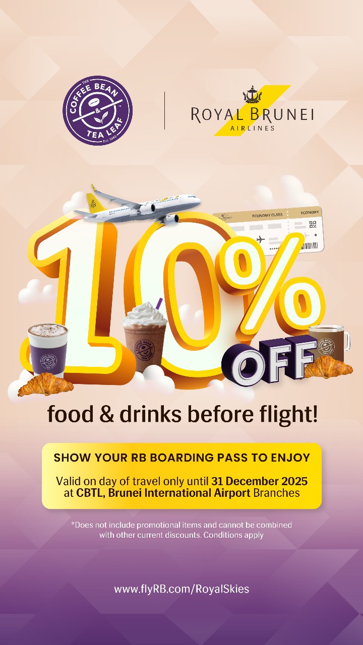 SHOW YOUR RB BOARDING PASS TO ENJOY. Valid on day of travel only until 31 December 2025 at CBTL, Brunei International Airport Branches